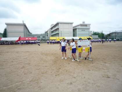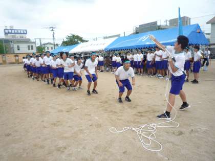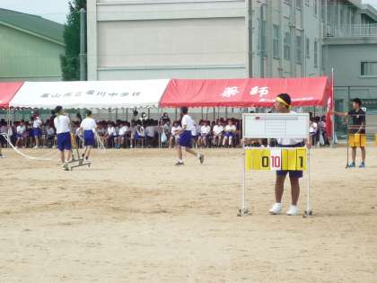 2学年種目の「みんなでとんだ!」の様子です。長縄や得点表示等の準備も、係が行っています。