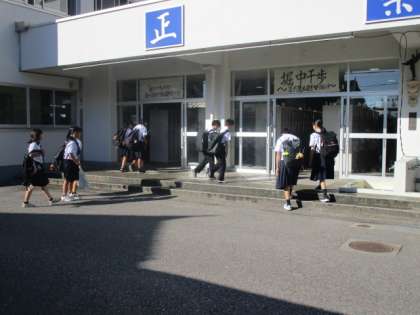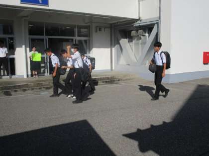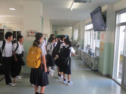 また、玄関を入ると、先週行われた運動会の応援合戦の様子が、モニターに映し出されており、登校した生徒達が見入っています。