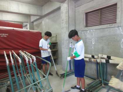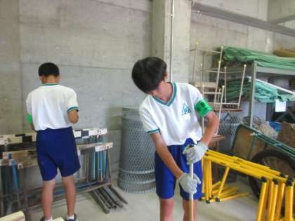 雨が少し降っていたので、倉庫内でほうきでの掃き掃除を頑張っていました。