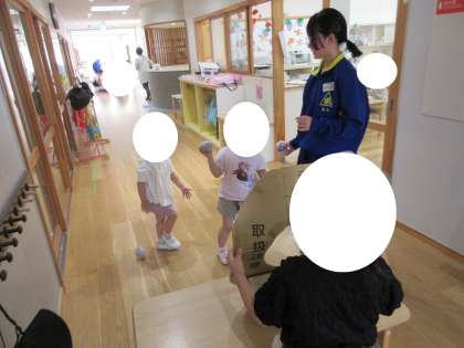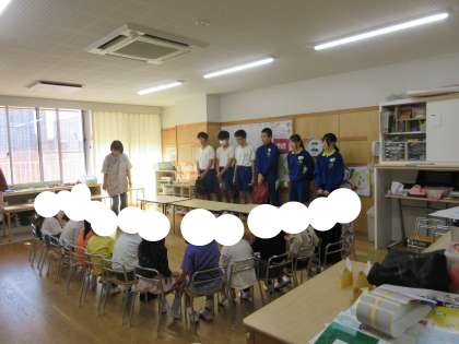 夏季休業中に作成した手作りおもちゃを持参し、保育園の5つの教室では、3〜4名の園児に対して生徒1名が担当し、1時間の「保育ふれあい体験」を実施しました。