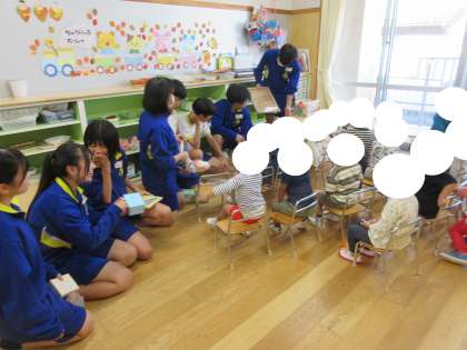 10月17日(木)9:30〜10:30に堀川保育園で、3年2組の生徒は、家庭科「保育ふれあい体験」を行いました。