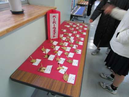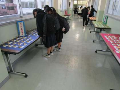 2学年フロアには、技術の授業で作成したペーパーウエイトが展示してあり、登校した生徒が力作揃いの作品に見入っていました。今週の保護者懇談会で来校の際は、ぜひご覧ください。