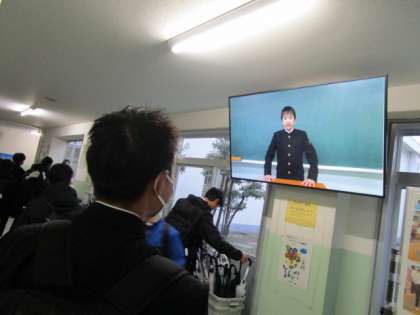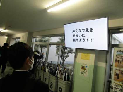 生徒会活動「足元をかためよう運動」の一環として、生徒玄関のモニターでの呼び掛けが始まりました。100パーセント達成を目指し、一人一人の意識を高めたいですね。