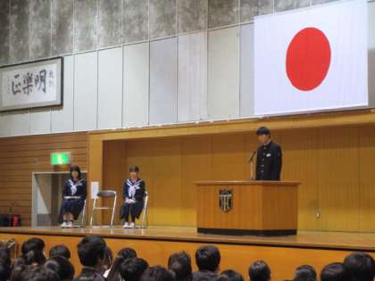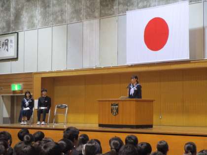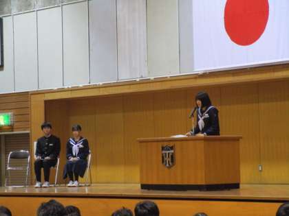 今回は、各学年の代表生徒1名ずつが、運動会や合唱コンクールといった行事、生徒会活動への取組、進級や進学へ向けた学習面の取組等、2学期の振り返りとこれからの抱負を述べました。