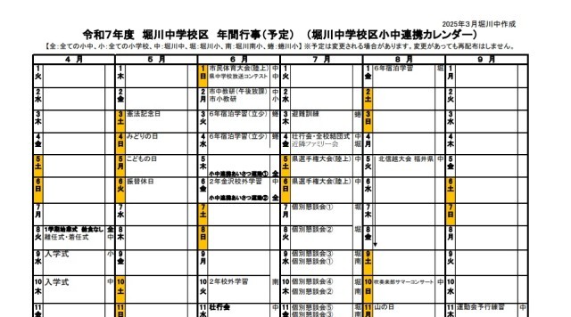 3月5日(水) 【R7年度行事予定】堀川中学校区小中連携カレンダー