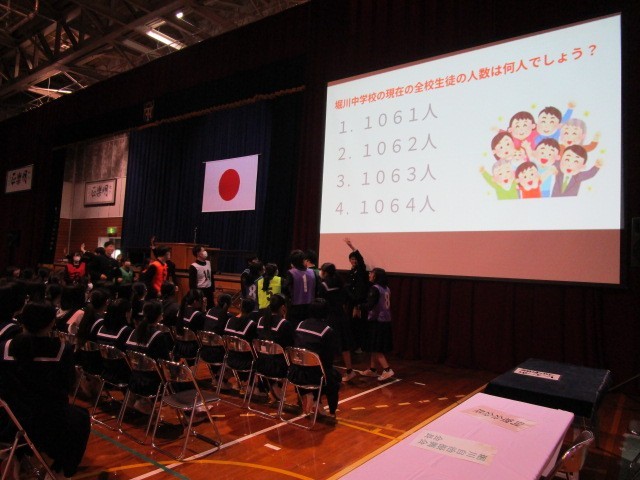 「3年間の思い出アンケート」や「クイズ!堀中ショック」では、3年生が中学校生活を振り返りながら、大変楽しそうに参加していました。最後には、全校生徒で校歌を歌い、生徒会長の言葉で閉会のところ、卒業生の有志から在校生に向けてエールが送られるというサプライズもあり、大変盛り上がりました。