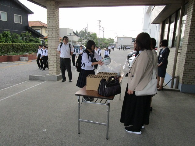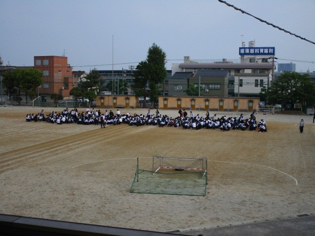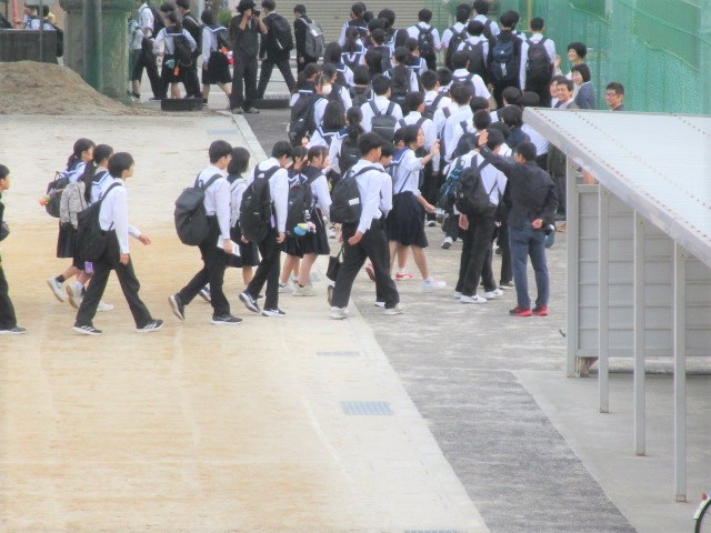 修学旅行出発の朝です。自転車通学生は、ヘルメットや鍵を預けて、グラウンドに集合しています。