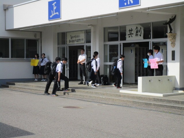 3年生が修学旅行での留守中も、2年生を中心に、いつものように「あいさつ運動」や「足元をそろえよう運動」の呼び掛けを行っています。とても頼もしいですね。