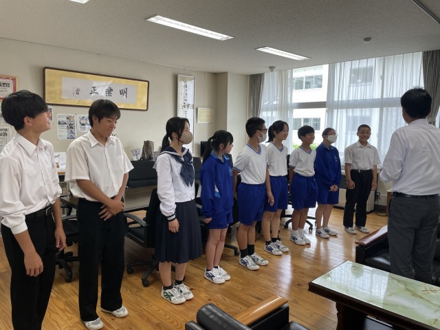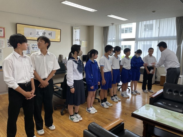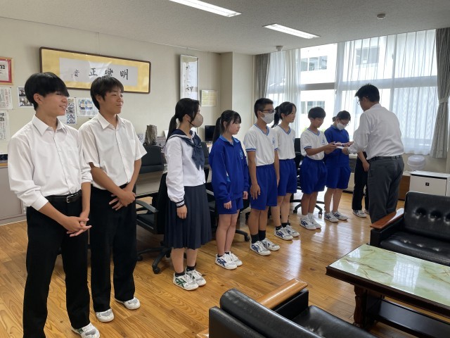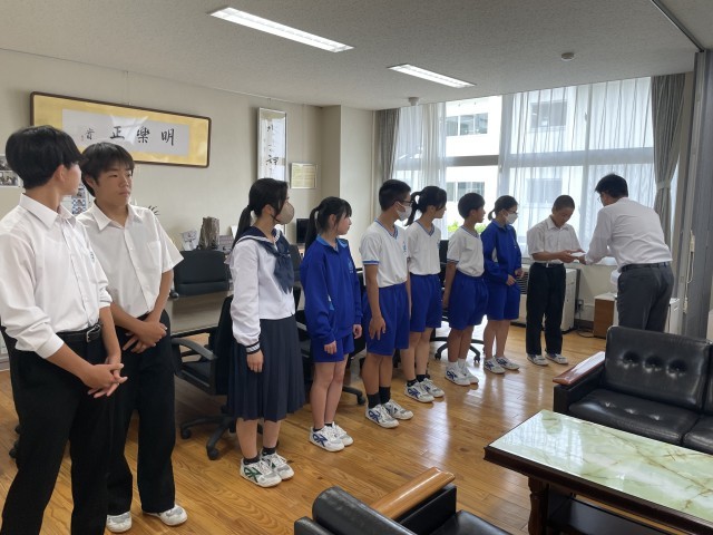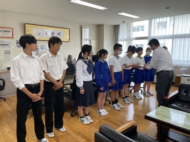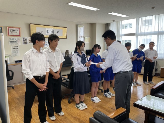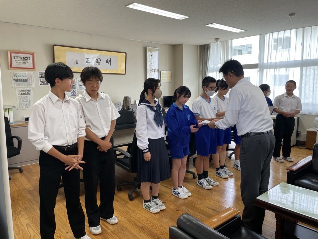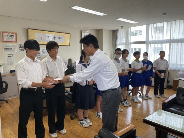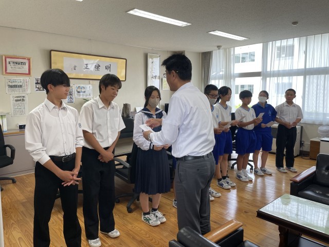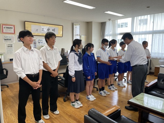 4月末に日本少年野球中日本大会に出場した本校生徒、今週末からの北信越中学校テニス選手権に出場する生徒に、TH会からの激励費を渡しました。
