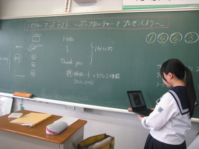Unit 1で学習した内容を踏まえ、日本のポップカルチャーについてALTに説明しています。緊張しましたが、練習どおり、どの生徒も聞き手の反応を確かめながら上手に説明ができました。