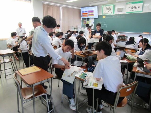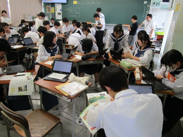 社会の授業では、「これからの日本と世界」の単元を行い、各自が設定した現代社会の特徴を捉える問いに対して、多数の生徒と意見を交流しながら答えを導き出す活動をしました。終盤には、「冷戦の終結」という視点から考察し、資料を適切に読み取って説明できたかを振り返りました。
