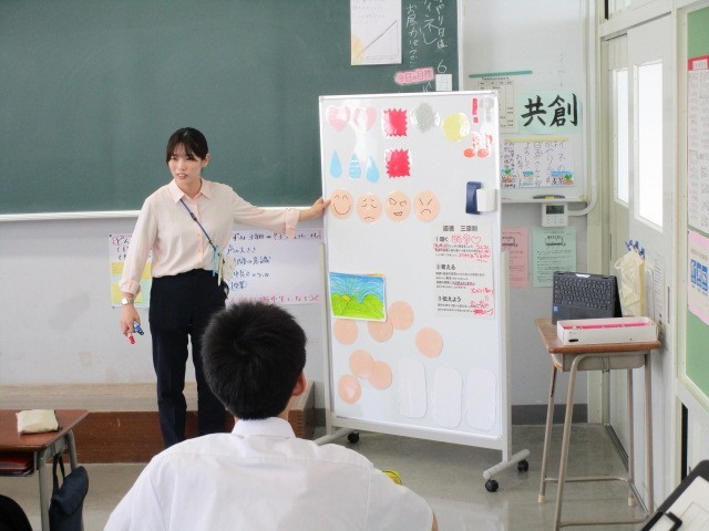 道徳の授業では、「橋の上のおおかみ」の教材を用いて、思いやりのある言動をされるとうれしい気持ちになることに気が付き、それを自分から他者にもしたいと思う気持ちを大切にすることを目指し、選択肢や数直線、イラスト等の多様なツールを用いて、それぞれに合った方法を選択し、自分の考えを表現しました。