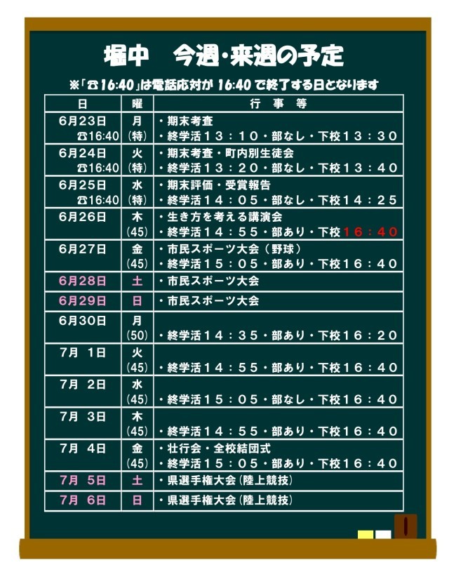 6月26日(木)の部活終了時刻が、16:20→16:40に変更になっています。