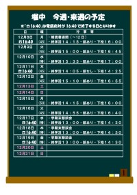 今週は特別な行事はありませんが、学期末に向けて、普段の学習や生活の取組をしっかりと振り返り、年末への準備をしておきましょう。 本日は、くもり時々雨、最高気温は13度、最低気温は6度の天気予報です...