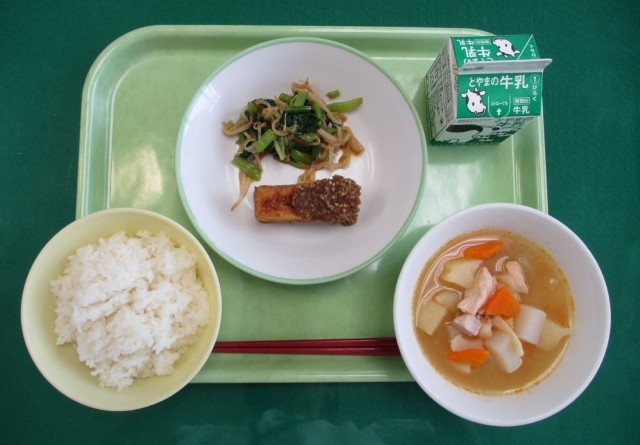 今日の献立は、「ごはん、牛乳、揚げ出し豆腐のごまだれかけ、香味和え、じゃがいもの南蛮煮」でした。