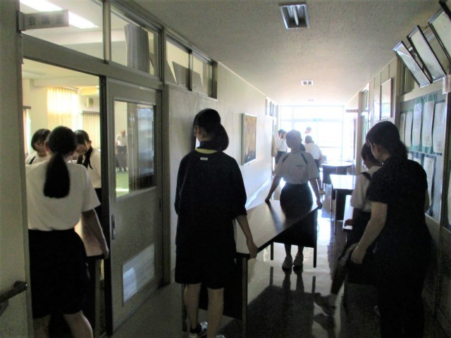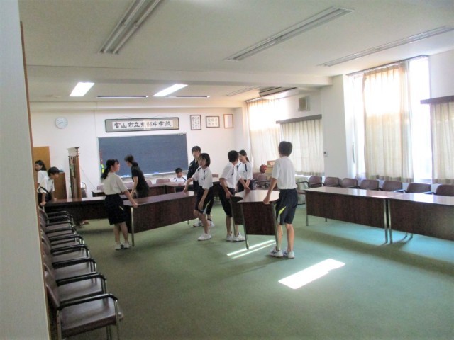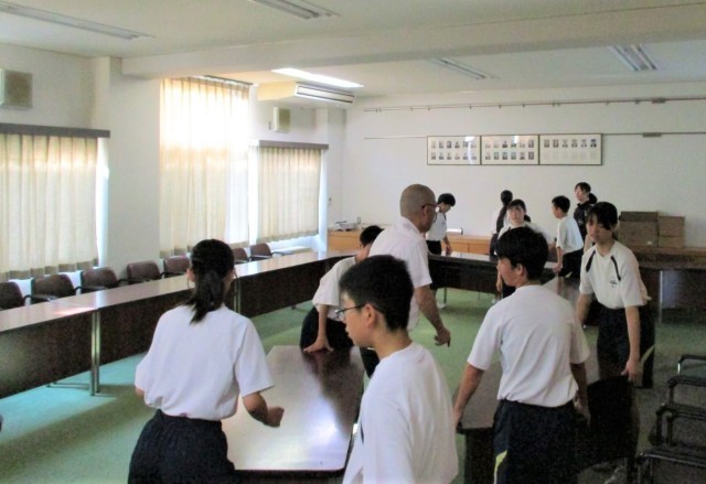 26日(火)会議室の復旧作業 公開日 2025/08/25 更新日 2025/08/30 東部中学校の様子 カーペット清掃のため、吹奏楽部の皆さんが廊下に運び出してくれたテーブルを、みんなで協力して再び会議室に運んで、きれいに復旧してくれました。吹奏楽部の皆さん、どうもありがとうございました。