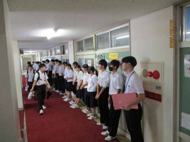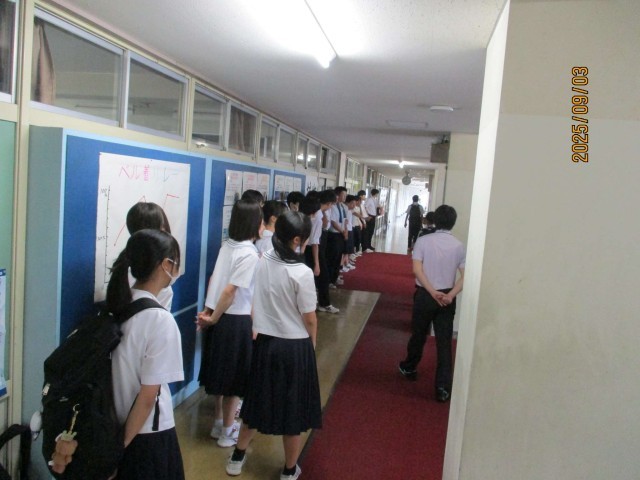3日(水)生徒会「挨拶リング」 公開日 2025/09/03 更新日 2025/09/03 生徒会 朝の生徒玄関では、生徒会執行部企画の活動である「挨拶リング」を実施しています。本日は、3年3組の生徒たちが挨拶運動を行っていました。