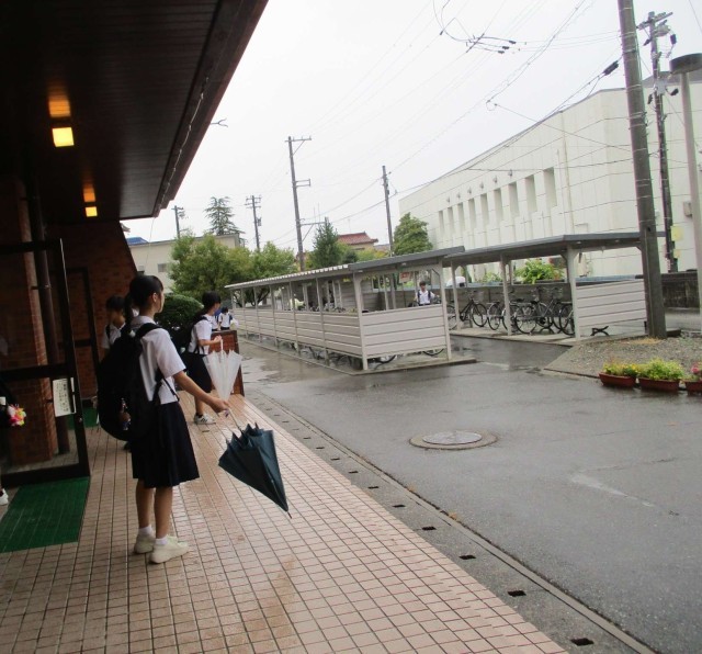 5日(金)登校の様子 公開日 2025/09/05 更新日 2025/09/06 東部中学校の様子 おはようございます。雨が降っていて、少し風も吹いて涼しさも感じる朝です。自転車通学の生徒たちは、合羽を着て登校してきました。今日は、放課後に体育大会の係別集会を行います。