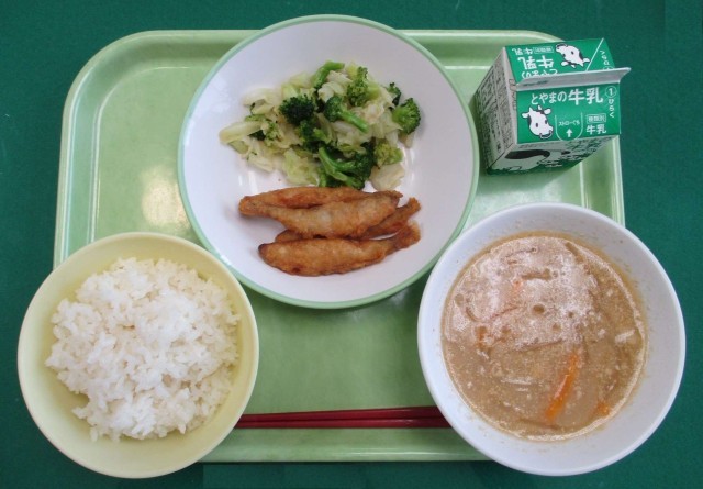 今日の献立は、「ごはん、牛乳、わかさぎのフリッター、ブロッコリーの和え物、坦々春雨スープ」でした。