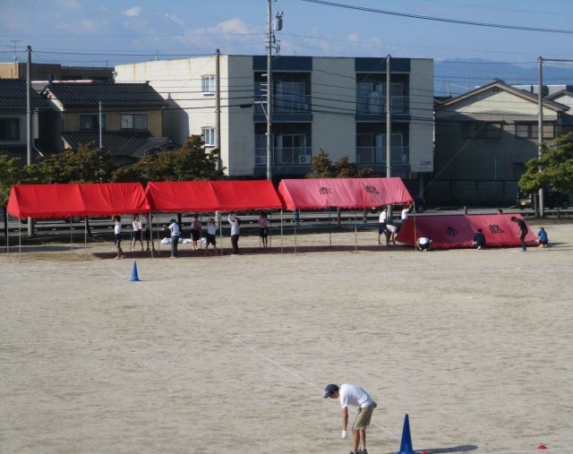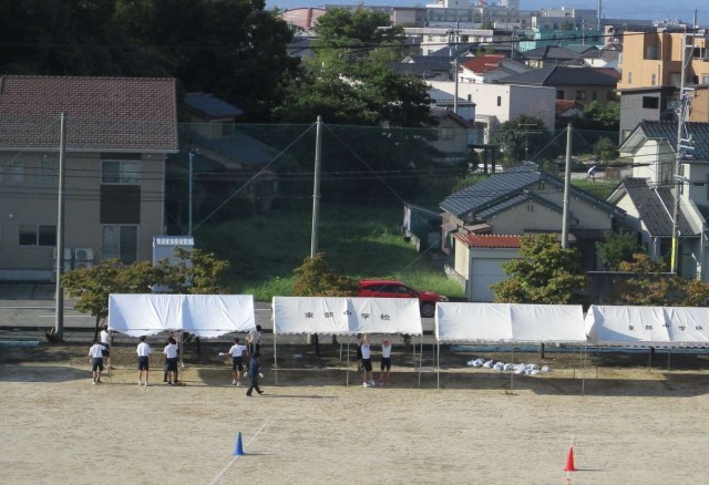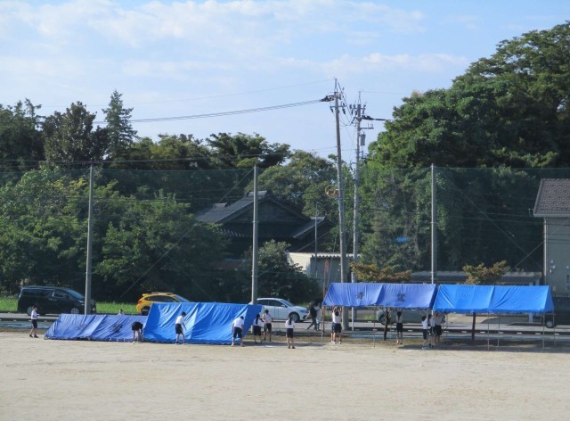 17日(水)テント設営 公開日 2025/09/17 更新日 2025/09/17 3学年 今日の体育大会の全体練習などに向けて、3年生の団リーダーとテント係の生徒たちは、朝早くから集合してテントの設営を行いました。皆さん、ありがとう。