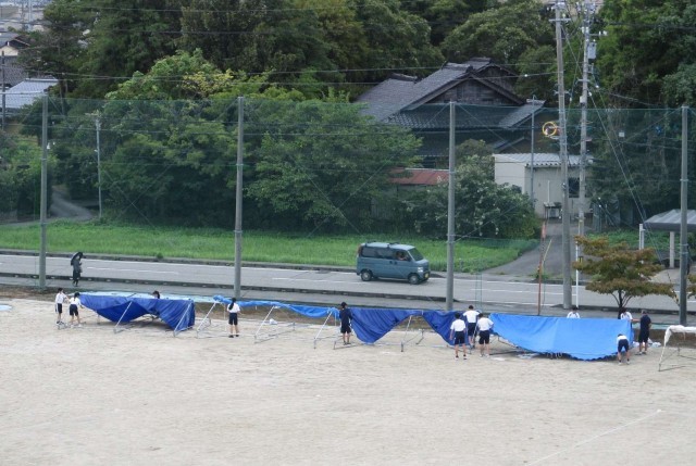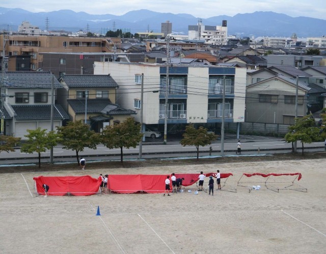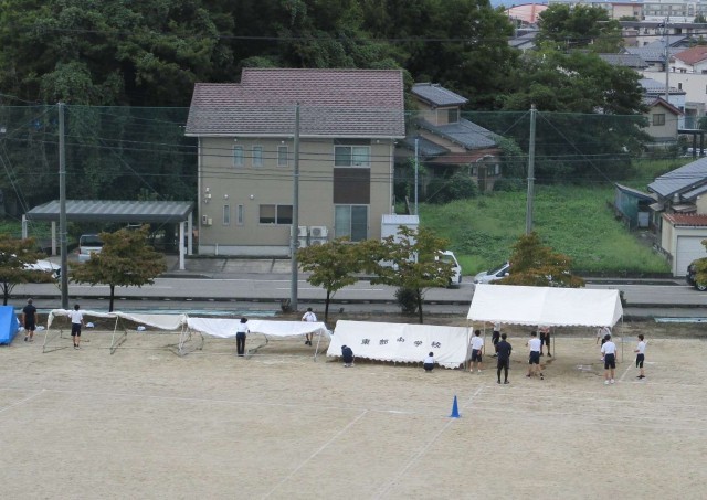 19日(金)テント設営【3学年】 公開日 2025/09/19 更新日 2025/09/19 3学年 3年生の団リーダーとテント係の生徒たちは、朝早くに集合し、全体練習に備えて、協力してテントを設営していました。皆さん、ご苦労さま。ありがとう。