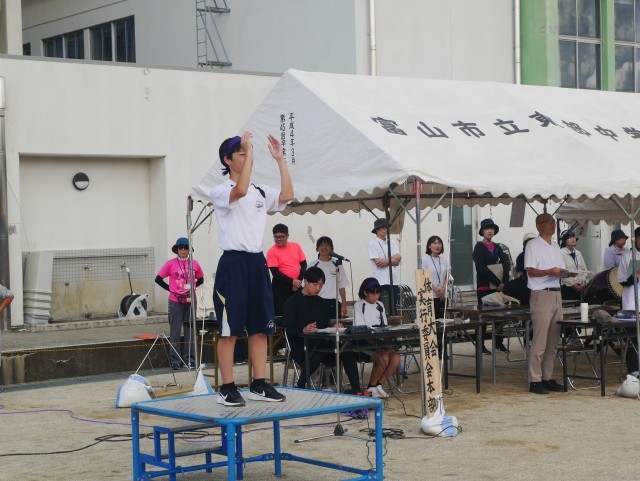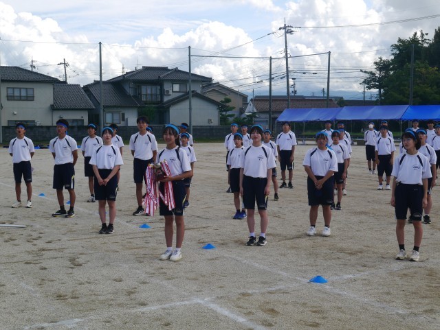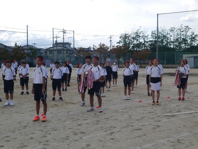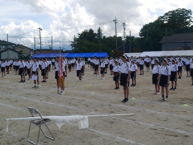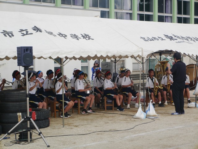 26日(金)第79回体育大会【閉会式 その2】 公開日 2025/09/26 更新日 2025/09/26 体育大会 【写真1:校歌斉唱】【写真2:白虎団の様子】【写真3:青龍団の様子】【写真4:朱雀団の様子】【写真5:吹奏楽部】 +2