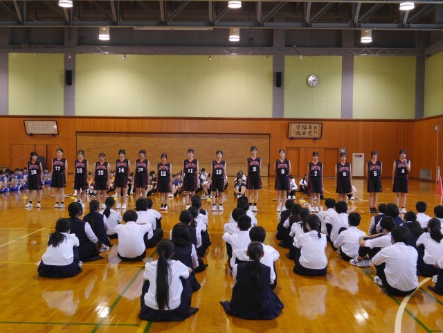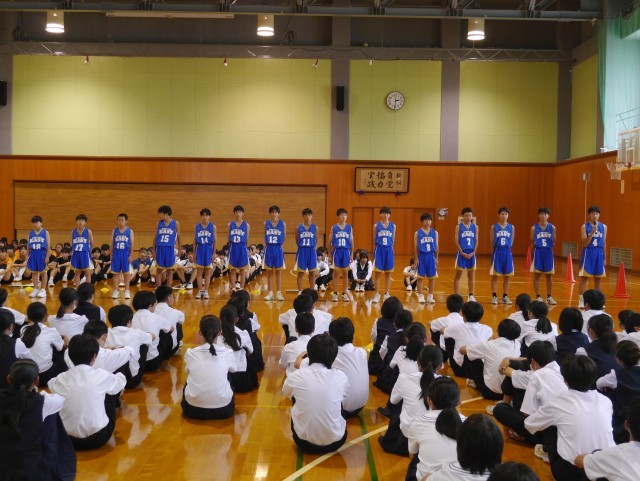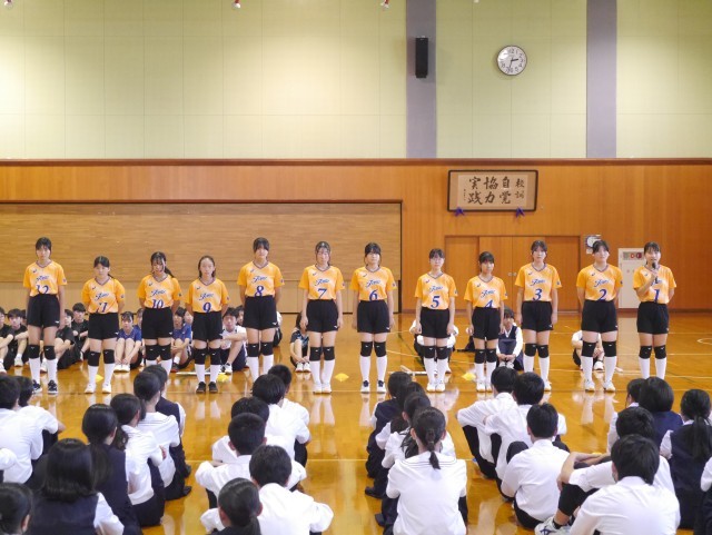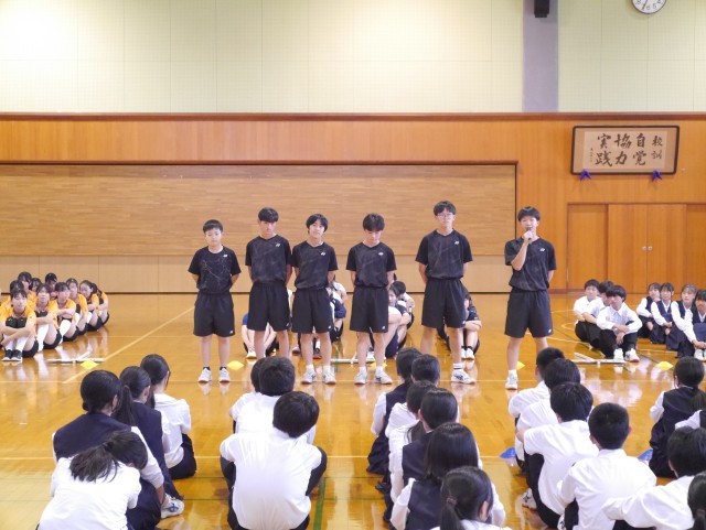 7日(火)新人大会壮行会② 公開日 2025/10/07 更新日 2025/10/07 部活動 各部の決意表明の様子を紹介します。【写真1:女子ソフトテニス部】【写真2:男子バスケットボール部】【写真3:女子バスケットボール部】【写真4:女子バレーボール部】【写真5:男子バドミントン部】 +2