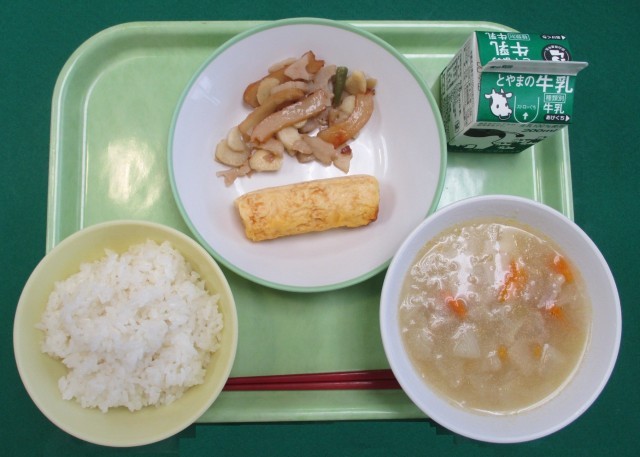 今日の献立は、「ごはん、牛乳、卵ロール、れんこんとまこもたけのきんぴら、ポトフ」でした。