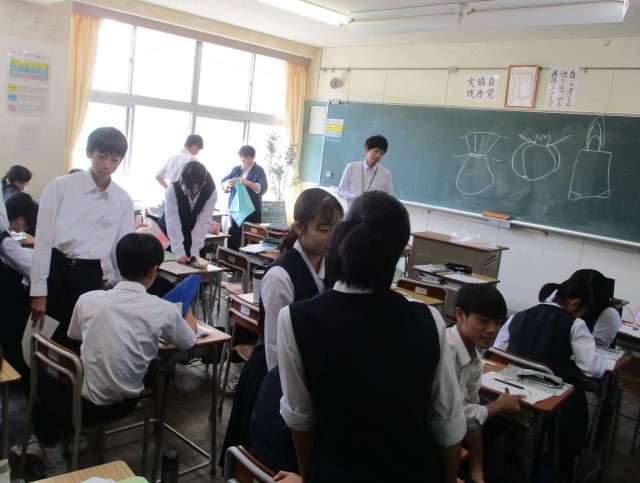 17日(金)家庭科 教育活動サポーターの先生の授業 公開日 2025/10/17 更新日 2025/10/17 2学年 2年生は、家庭科のエコバック製作の授業で、教育活動サポーターの先生から裁縫などの指導を受けています。