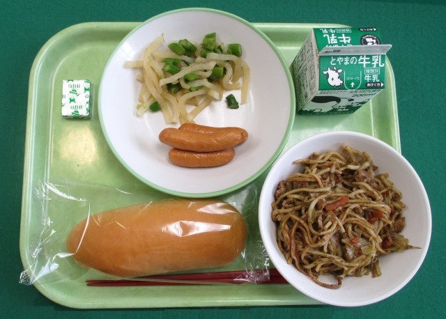 21日(火)今日の給食 公開日 2025/10/21 更新日 2025/10/21 東部中学校の様子 今日の献立は、「コッペパン(減量)、牛乳、あらびきウインナー、大根サラダ、焼きそば、ポケットチーズ」でした。「焼きそば」は、柔らかい麺と具材にソースが香ばしく、とてもおいしかったです。
