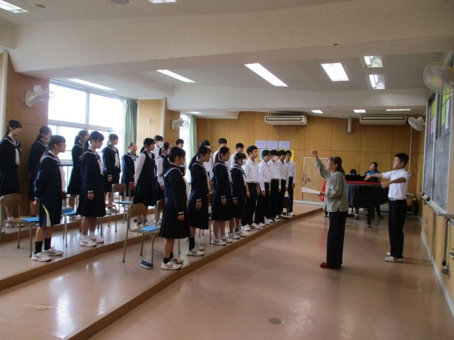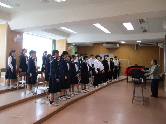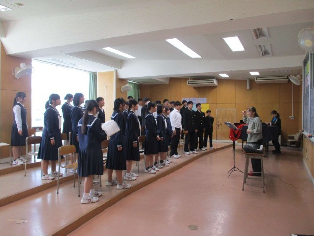 28日(火)3年生音楽 教育活動サポーターの先生の授業 公開日 2025/10/28 更新日 2025/10/29 3学年 3年生は、音楽の授業の時間に、教育活動サポーターの先生から合唱の指導を受けています。今日が合唱コンクール前の最後のご指導になりました。