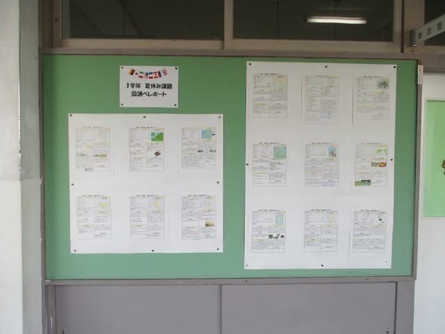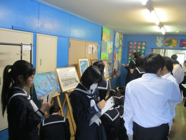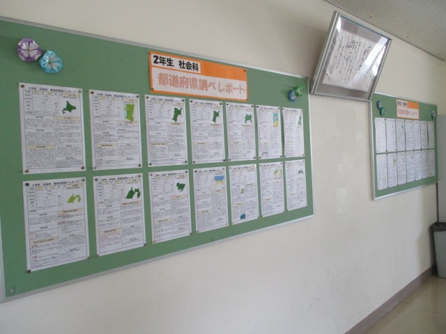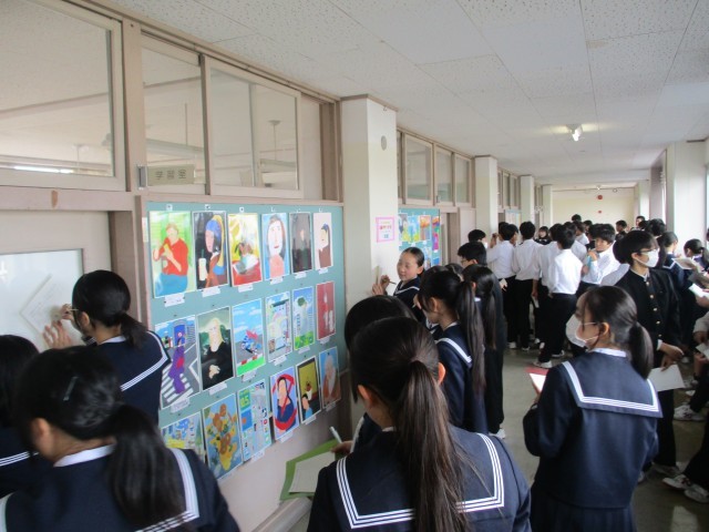 29日(水)文化活動発表会【作品展示】 公開日 2025/10/29 更新日 2025/10/29 東部中学校の様子 【写真1枚目:3年実術作品「名画を私流にデザインしよう」】【写真2枚目:2年美術「ライトスクラッチ」】【写真3枚目:1年美術「マイシューズに願いを込めて」】【写真4枚目:美術部作品「絵画・デザイン」】【写真5枚目:科学展覧会作品】【写真6枚目:2年社会「都道府県について調べよう」】【写真7枚目:1年社会「世界の国について調べよう」】 +4