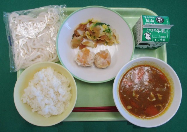 今日の献立は、「ごはん、牛乳、にんじんシューマイ、福神和え、カレーうどん」でした。