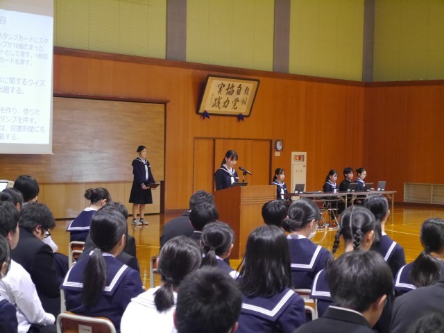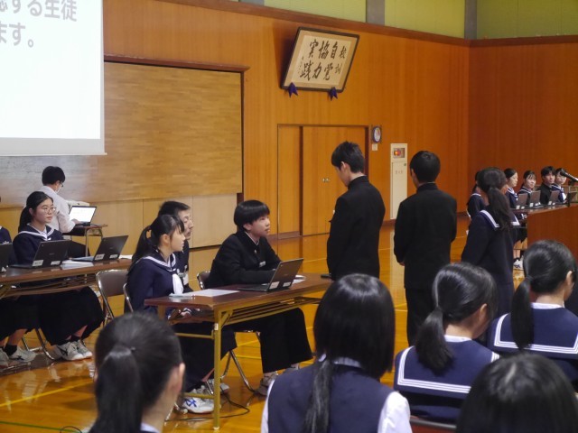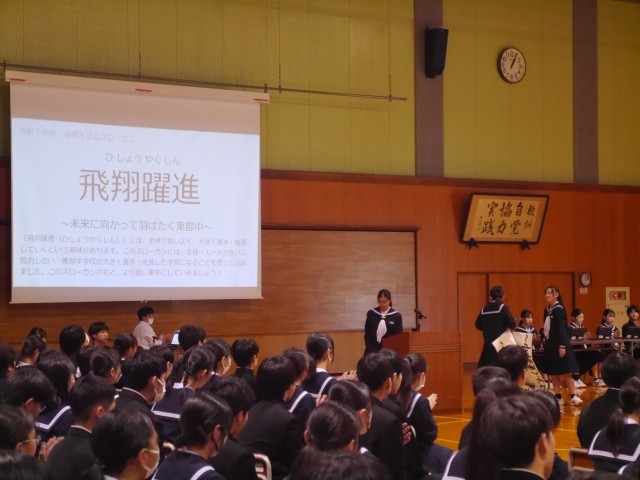 5日(水)生徒総会 公開日 2025/11/05 更新日 2025/11/05 生徒会 本日行われた生徒総会の様子を紹介します。【写真上:新スローガンの発表】【写真中:活動計画案の説明】【写真下:採決・承認の様子】