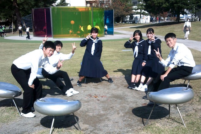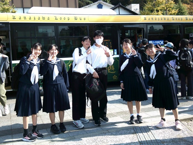 7日(金)金沢校外学習②【2学年】 公開日 2025/11/07 更新日 2025/11/07 2学年 班別活動の様子を紹介します。【写真上:金沢21世紀美術館】【写真中:体験活動(金箔貼り)】【写真下:バス停にて】
