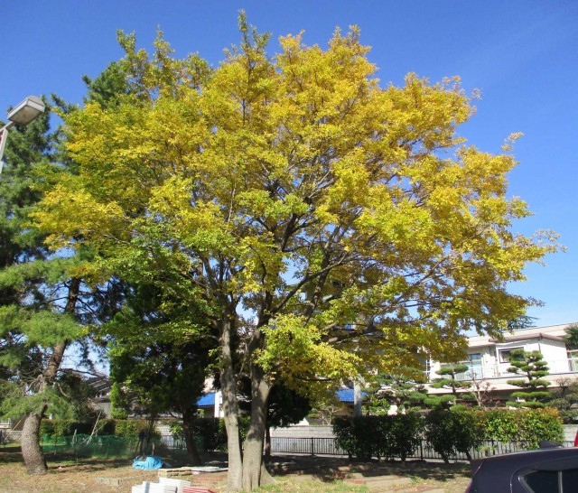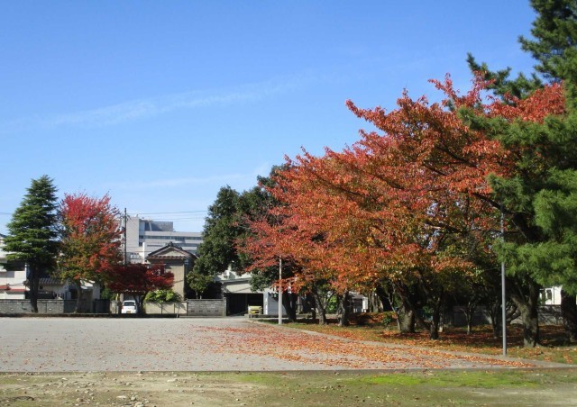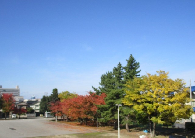 前庭の木々が鮮やかに色づき、青空によく映えて、紅葉が見頃を迎えています。
