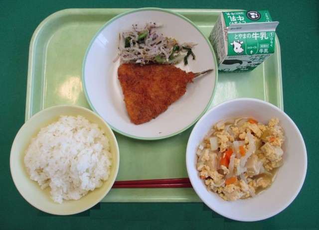 14日(金)今日の給食 公開日 2025/11/14 更新日 2025/11/15 東部中学校の様子 今日の献立は、「ごはん、牛乳、あじフライ、ゆかり和え、卵とじ」でした。「あじフライ」は、サクサクでボリューム感があり、とてもおいしかったです。