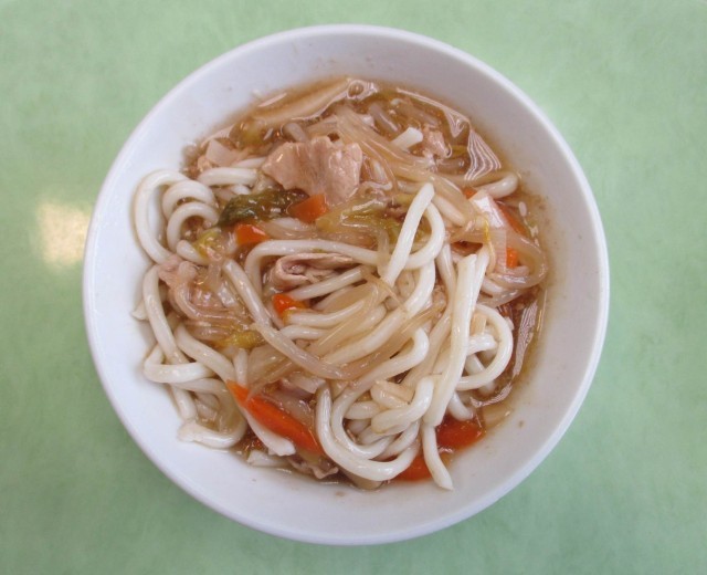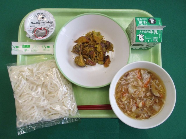 今日の献立は、「ソフト麺、牛乳、ソフト麺のとやまの五目あん、さつまいものきなことくわの葉がらめ、りんごヨーグルト」です。