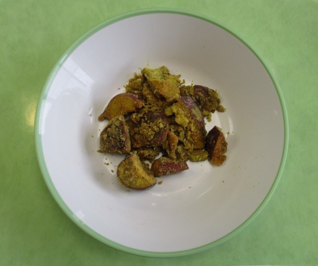 今日の「さつまいものきなことくわの葉がらめ」には、八尾地域で育ったくわの葉が使われており、油で揚げたさつまいもに、きなことくわの葉がまぶしてあります。