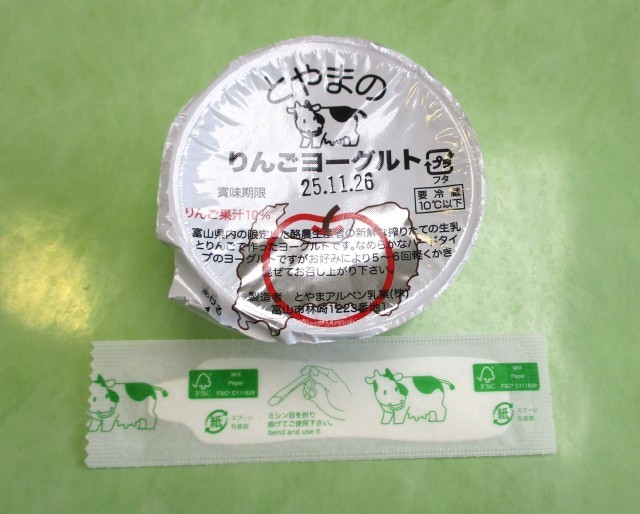 富山県産の食べ物は、にんじん、はくさい、しいたけ、ねぎ、さつまいも、きな粉、くわの葉、りんごヨーグルト、牛乳です。