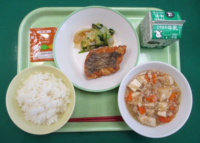 今日の献立は、「ごはん、牛乳、ホキの竜田揚げ、チンゲンサイひたし、厚揚げのそぼろ煮、大豆ふりかけ」でした。