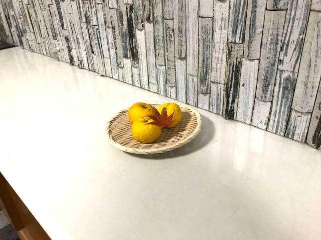 正面玄関に飾られている柚子に、紅葉の葉が添えられていました。