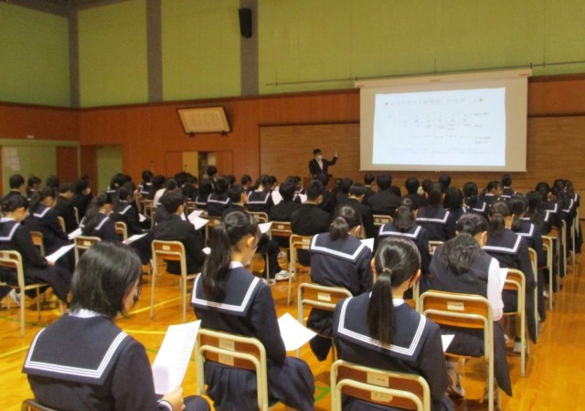 この後の進路選択に向けて、入試までの流れや仕組み、一人ひとりが意識していきたい大事なこと、そして来週から始まるテキスト学習の進め方等について、先生方からお話がありました。