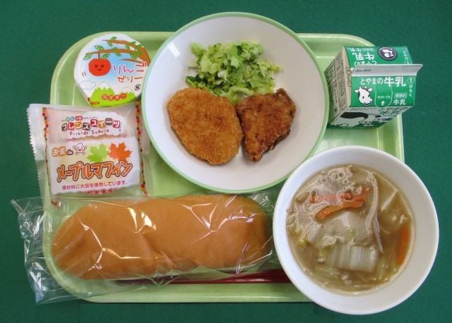 今日の献立は、「コッペパン、牛乳、そえ野菜、はるさめスープ」と