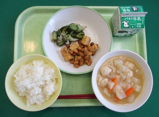 今日の献立は、「ごはん、牛乳、大豆のみそからめ、ゆかり和え、かぶと肉団子のポトフ」です。