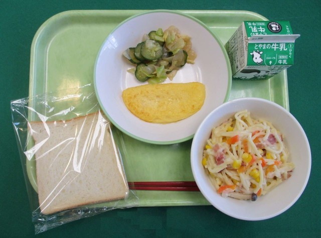 9日(火)今日の給食 公開日 2025/12/09 更新日 2025/12/10 東部中学校の様子 今日の献立は、「食パン(減)、牛乳、オムレツ、こんにゃくサラダ、クリームスパゲッティ」でした。「クリームスパゲッティ」は、クリームとコーンや玉ねぎなどの具材がよくなじんで、まろやかでやさしい味わいでした。