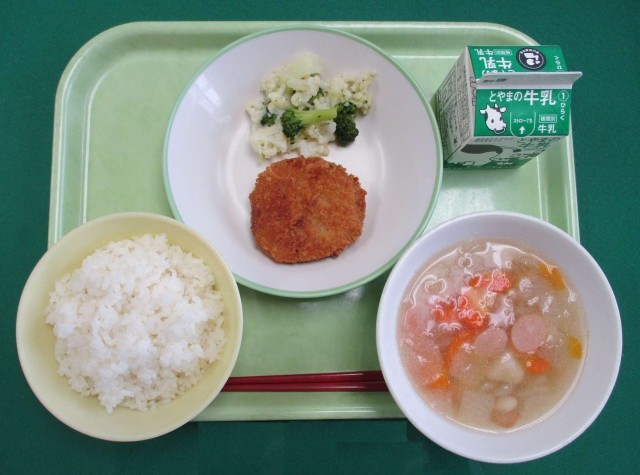 今日の献立は、「ごはん、牛乳、メンチカツ、花野菜サラダ、ポテトスープ」でした。