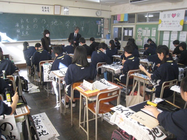 今日は、2年生の全クラスで、書き初めの指導をしていただきました。