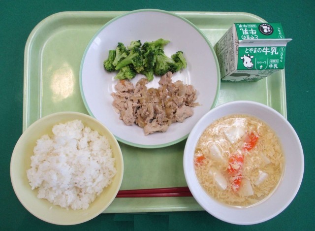 15日(月)今日の給食 公開日 2025/12/15 更新日 2025/12/15 東部中学校の様子 今日の献立は、「ごはん、牛乳、豚肉のジャンロー、ゆでブロッコリー、かきたま汁」でした。「ジャンロー」は、「醬肉」と書き、焼かずに醤油味の煮汁で柔らかくなるまで煮込む中国料理だそうです。豚肉が玉ねぎやしょうがと一緒に柔らかく煮込んであり、玉ねぎの甘みもあって、とてもおいしかったです。