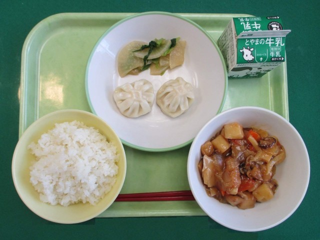 今日の献立は、「ごはん、牛乳、えび包子、大根のナムル、酢豚」でした。